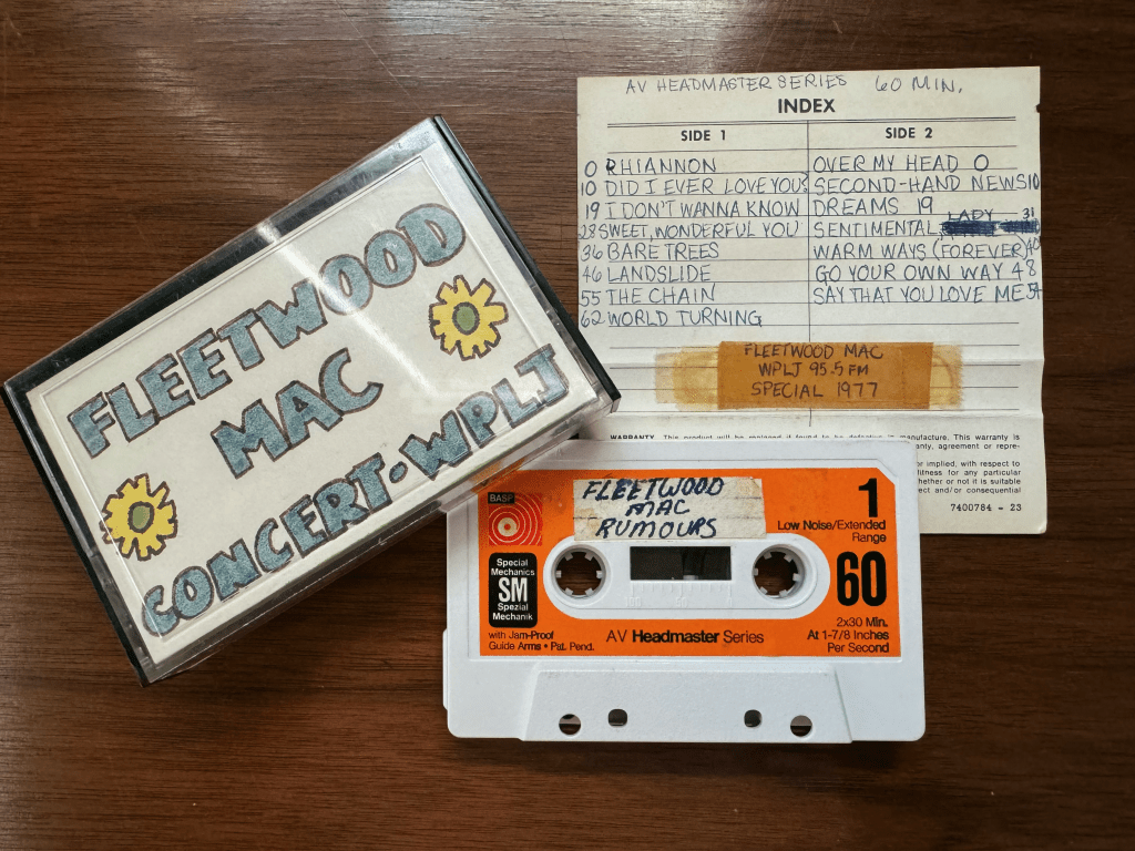 Other music-related cutenesses of my Mom include the Fleetwood Mac Rumors concert taped straight from the radio in 1977, the product of a bygone era: sitting by a radio speaker to capture music live (try not to sneeze!). She re-found the cassette just a few years ago. Thank God my family kept our boombox to play CDs and cassettes to this day.